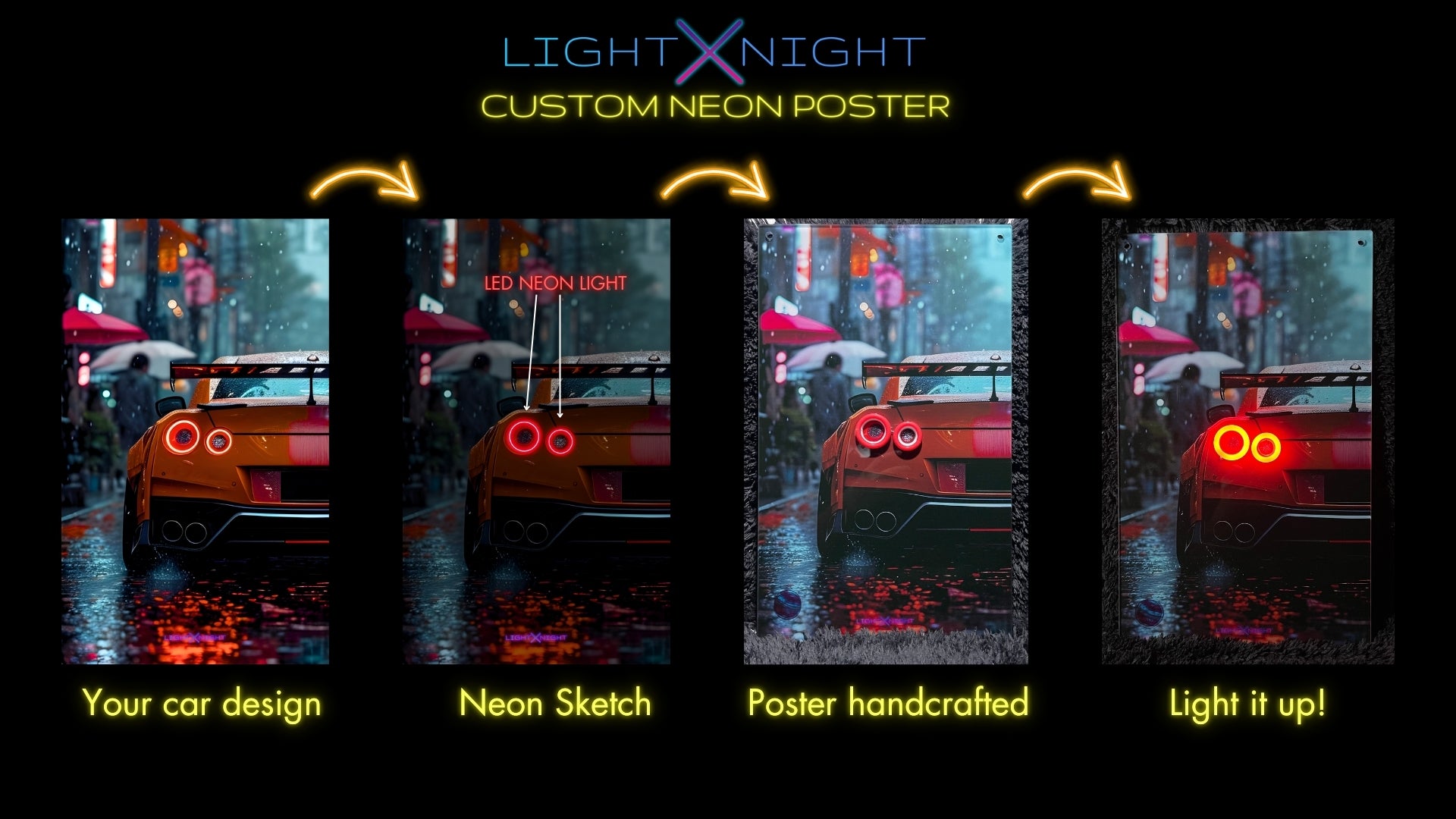 Welcome to the world of personalized brilliance at Light X Night! Our custom neon posters are the perfect fusion of art, technology, and your unique vision. Whether you're looking to showcase your favorite car, immortalize a cherished memory, or add a vibrant touch to your space, our handcrafted neon posters make it possible.