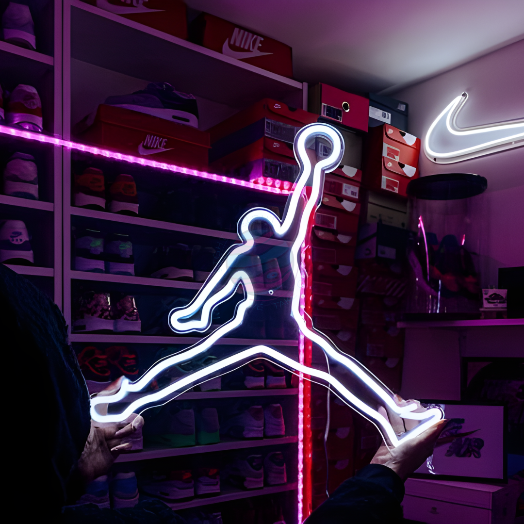 Make a statement with this neon Air Jordan sign! Light up your room and show off your shoes collection in a cool way. Get the air of a sports bar in your home with this bright neon piece! Wanna be the hottest sneakerhead on the block? Then this is the sign for you!