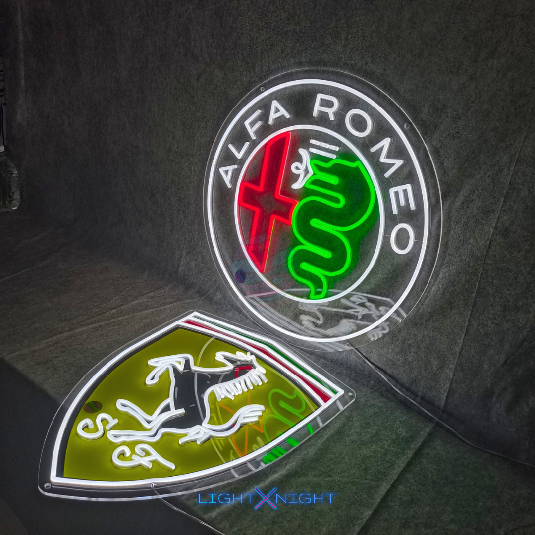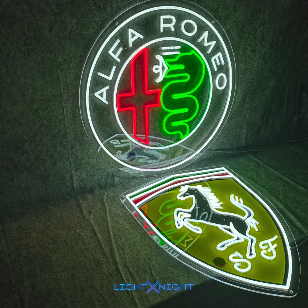 Introducing the Ferrari Neon Sign by Light X Night - a dazzling display of speed and sophistication. This neon sign features the iconic Ferrari logo, meticulously UV-printed on a dynamic backdrop, creating a visual masterpiece that captures the essence of Ferrari's design.