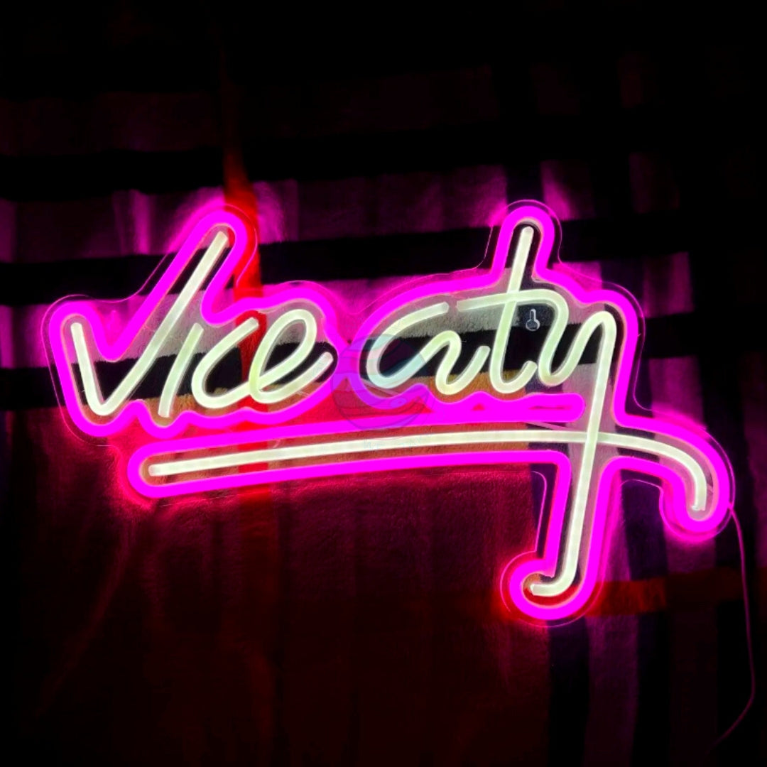 Welcome to "Vice City" with this neon sign that will bring the pink vibe of Grand Theft Auto Vice City right into your home. Whether you're a dedicated fan or someone looking to bring a punch of color and nostalgia to any room, you won't be disappointed. This sign will make your place the hottest spot in town!